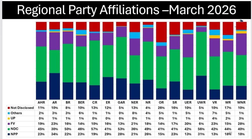 According to the data, the National Democratic Congress currently leads party affiliation in several regions across the country, including areas historically considered competitive battlegrounds. Most striking is the narrowing margin between the NPP and its main political rival in the Ashanti Region, where the party has traditionally enjoyed overwhelming loyalty.