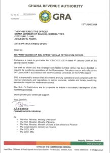 A statement issued by the GRA on June 12, 2024 said “We wish to inform you that Strategic Mobilisation Limited (SML) has been directed to resume its monitoring operations of the Downstream Petroleum sector with effect from 14th June 2024 in accordance with the Presidential Directives on the KPMG report.