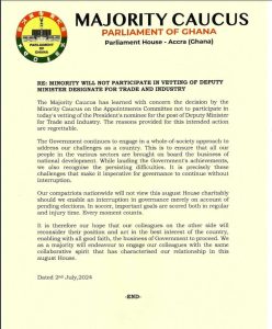 However, the Majority Caucus, in a statement dated Tuesday, July 2, has described the reasons for the boycott as “regrettable” and urged the Minority to reassess their decision.