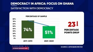 Details of the Afrobarometer report suggested a massive decline in democracy satisfaction among countries in Africa, with Ghana experiencing a double digit decline. In 2011/2013, the percentage of Ghanaians that were satisfied with democracy stood at 74%.
