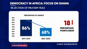 This was evident in Ghana as well as there was some willingness to accept military intervention if need be. Comparing the rejection-of-military rule in 2011/2013 and 2021/2023, the rate has decreased significantly from 86% to 68%. This shows a decrease in the rejection of military rule among the Ghanaian people.