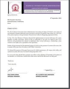 The Technical University Senior Administrators’ Association of Ghana (TUSAAG) is threatening a nationwide strike by the end of September 2024 if their demands are not met.