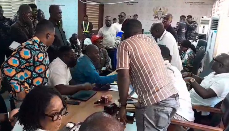 The dispute began when the New Patriotic Party (NPP) parliamentary candidate, Mike Oquaye Jnr, raised objections to the ongoing collation process, JoyNews’ James Avedzi reported.