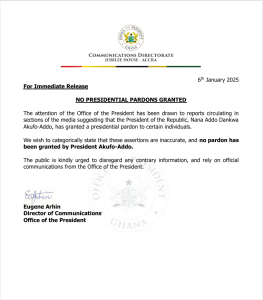 “We wish to categorically state that these assertions are inaccurate, and no pardon has been granted by President Akufo-Addo,” the statement read.
