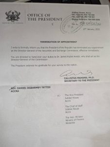 President John Dramani Mahama has relieved Rev. Daniel Ogbarmey Tetteh of his duties as Director-General of the Ghana Securities and Exchange Commission (SEC).