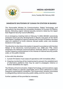 Samuel Nartey George, Minister for Communication, Digital Technology, and Innovations has ordered the immediate shutdown of Gumah FM in Bawku following urgent national security concerns raised by the Upper East Regional Security Council (REGSEC).