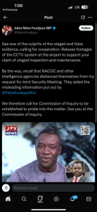 “See one of the culprits of the staged and false evidence, calling for cooperation. Release footages of the CCTV system at the airport to support your claim of staged inspection and maintenance,” he wrote, challenging the credibility of NACOC’s account.