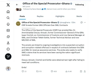 These developments follow earlier arrests of other former GRA officials—Rev. Dr. Ammishaddai Owusu-Amoah, Isaac Crentsil, and Christian Tetteh Sottie—who are still in custody after failing to meet bail conditions. The OSP stated that these arrests form part of a broader probe into suspected corruption and related offences surrounding GRA’s contracts with SML for revenue assurance services.