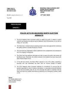 The Accra Regional Police Command has issued an update on the violent incidents and assaults that occurred during the Ablekuma North Parliamentary re-run election held on Friday, July 11, 2025.