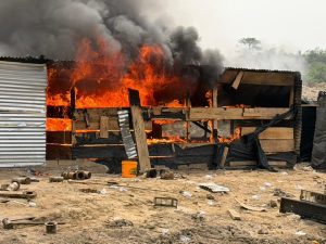 The task force moved methodically, dismantling what remained of the illegal mining infrastructure. Makeshift structures were set ablaze. Logistics facilities were destroyed. A heavy-duty multipurpose water pumping machine-critical to sustaining mining operations-was deliberately destroyed to ensure the site could not be reactivated quickly.